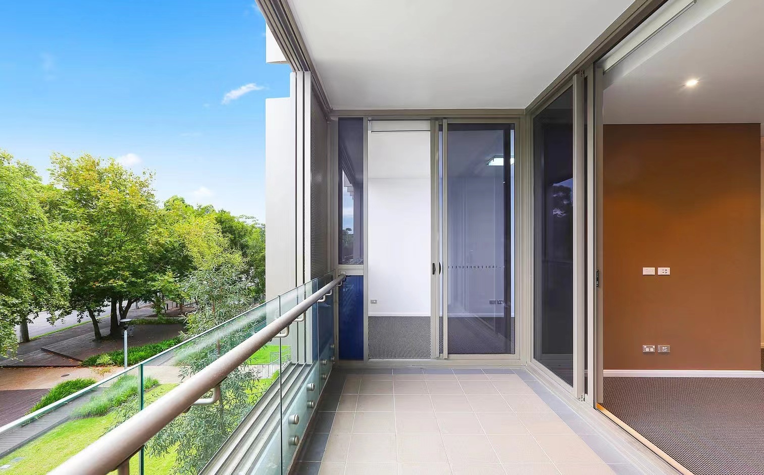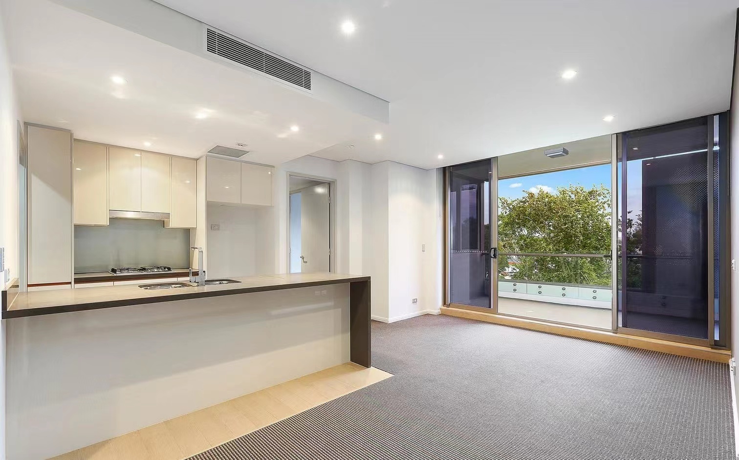 - A wall of sliders opens the space out to the generous balcony which boasts privacy and weather protection shutters