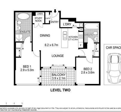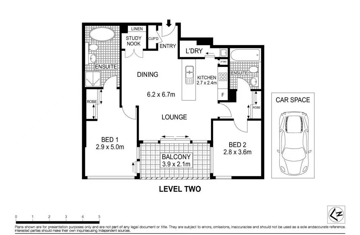 - Two bedrooms are both generous with clever design providing the option of two master suites with ensuite